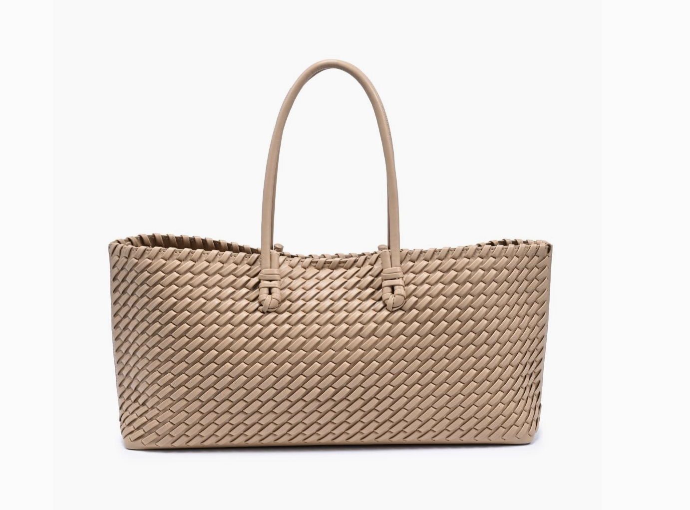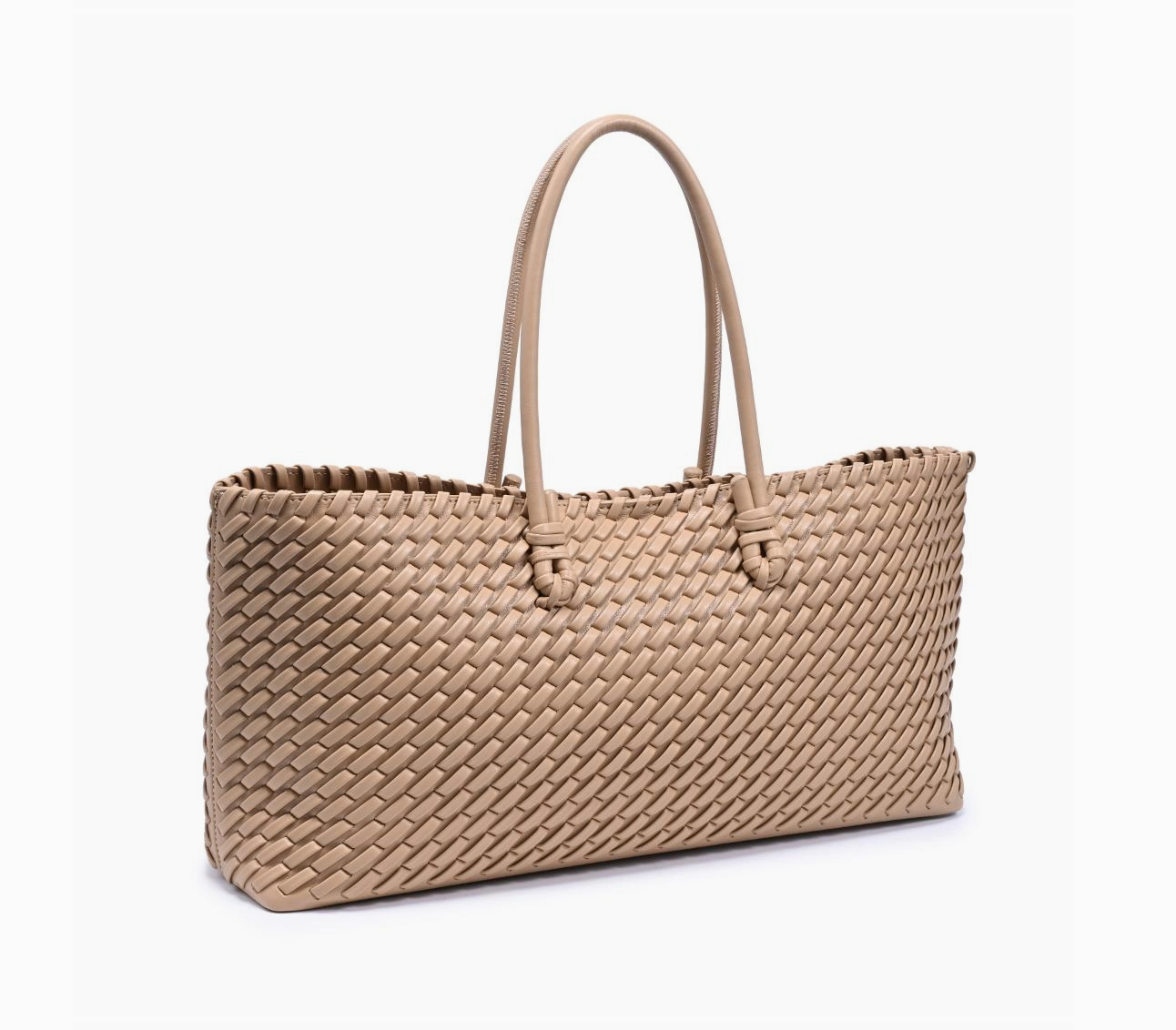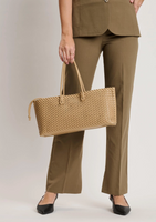 Woven sophistication with long‑line proportions — Nola Tote. A sleek, textured women's tote with an all‑over woven body and double shoulder straps. Lightweight yet structured, it fits a laptop, daily essentials and more. Minimal hardware, polished finish, and an organized interior make it a refined work tote or everyday bag. Perfect for trend‑savvy women who want roomy function without fuss. *Item Type: Tote *Material: Vegan Leather