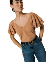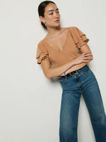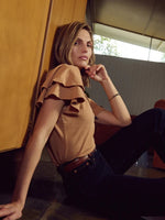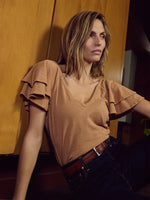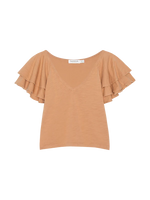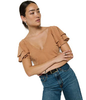 PRODUCT FIT AND DETAILSSEE SIZE CHARTFit: Signature Nation fit. Slightly easy through the body, not fitted or oversized.Details: Bra friendly, Ruffle detail, V-NeckFABRIC CONTENT AND CARE