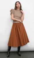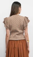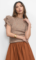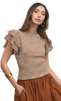 This delightful knit top is crafted from a unique, textured marled yarn in versatile, earthy tones, offering subtle depth and visual interest. It features a classic crew neckline and a flattering fitted silhouette, beautifully complemented by distinctive ruffled flutter sleeves that add a touch of romantic playfulness and movement.