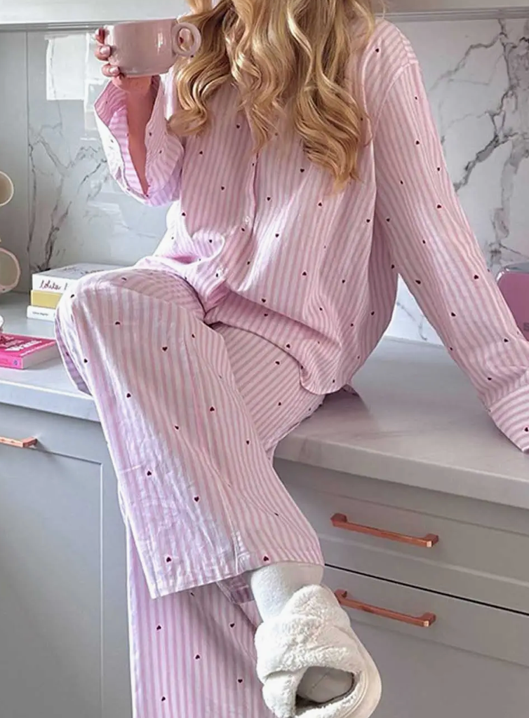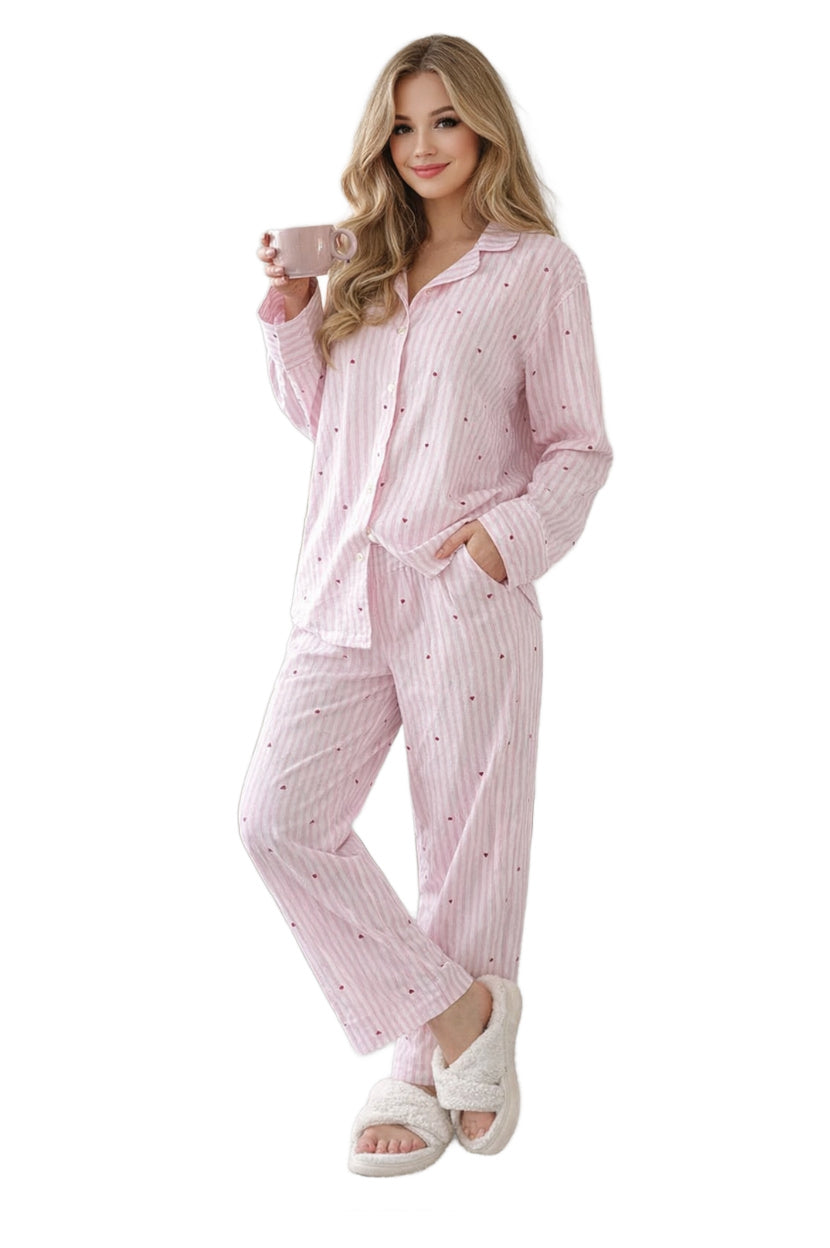 Sweet dreams start here. This soft pink and white striped pajama set is sprinkled with tiny heart details for an extra touch of charm. Featuring a relaxed button-front top with a classic collar and easy, straight-leg pants with pockets, it’s the perfect blend of cozy and cute. Made for slow mornings, coffee in hand, and lounging all day long — you may never want to change out of them.