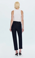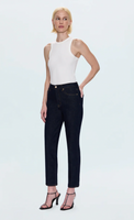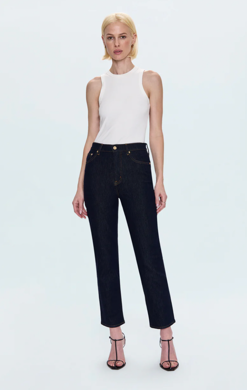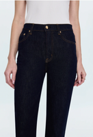 The silhouette that gets straight to the point. Bri sits confidently at a high rise and features a slim straight leg that hits at the perfect ankle length, finished with a 28" inseam. Nightfall brings mysterious sophistication with its deep dark wash that captures the allure of midnight.