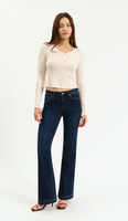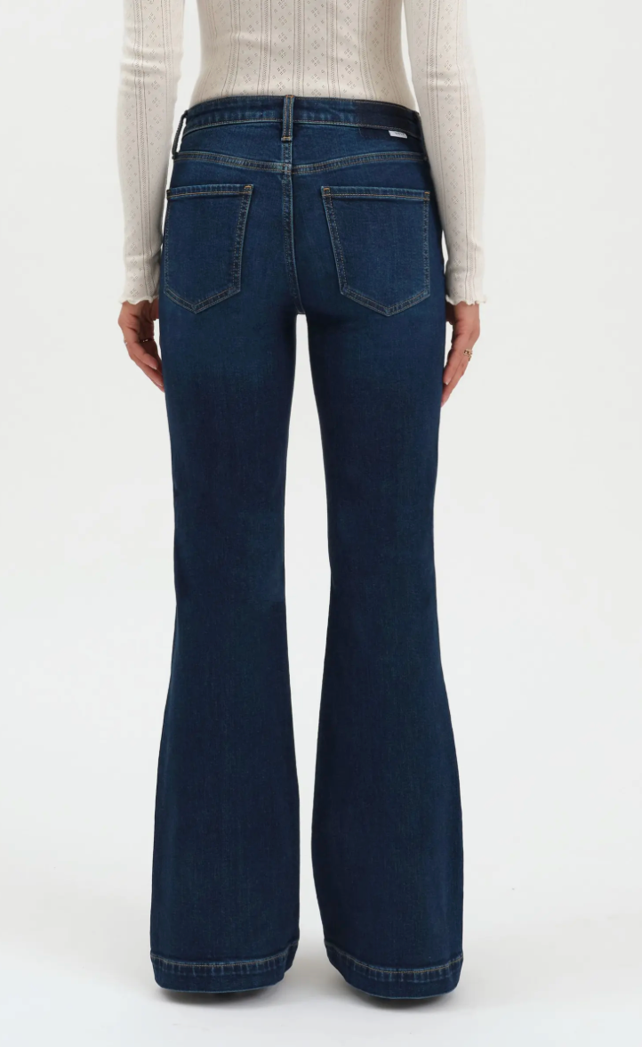 The Heartbreaker is a mid-rise flare in a classic indigo dark wash. This flattering silhouette will take you from daytime to date night with ease.o