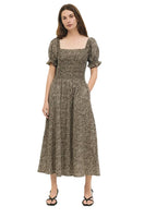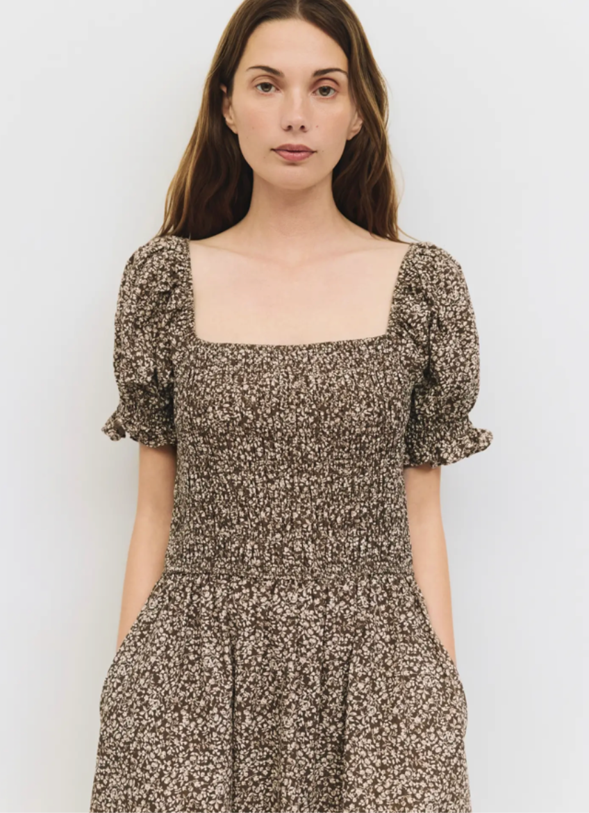 The Harleen Dress is a fitted midi dress crafted from smocked floral cotton fabric. It features a square neckline, short puff sleeves, and ruffle details on the neckline and sleeve cuffs. A delicate and structured piece designed for effortless style.