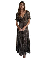 Soft woven rayon dress in chocolate with ivory polka dots. Features a tie-front neckline, short puff sleeves, and a flowing A-line skirt. Lightweight and flattering — an effortless piece for day or evening.