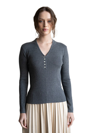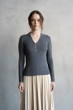 V-Neck Button Closure Knit Top Grey