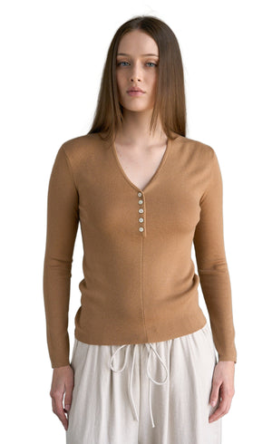 V-Neck Button Closure Knit Top Beige