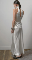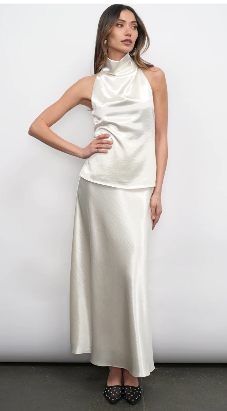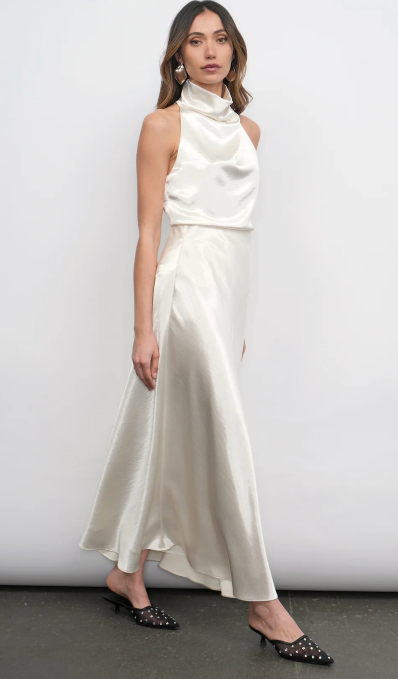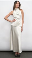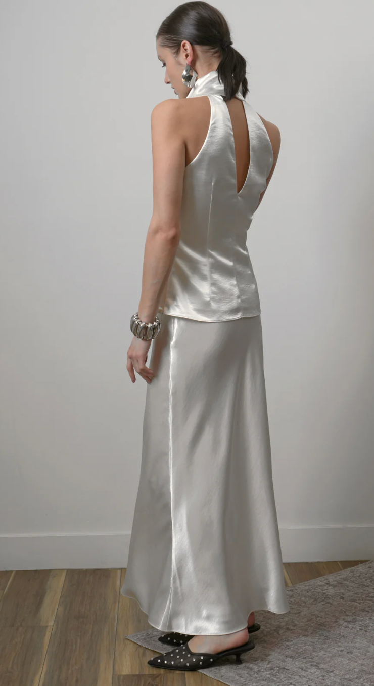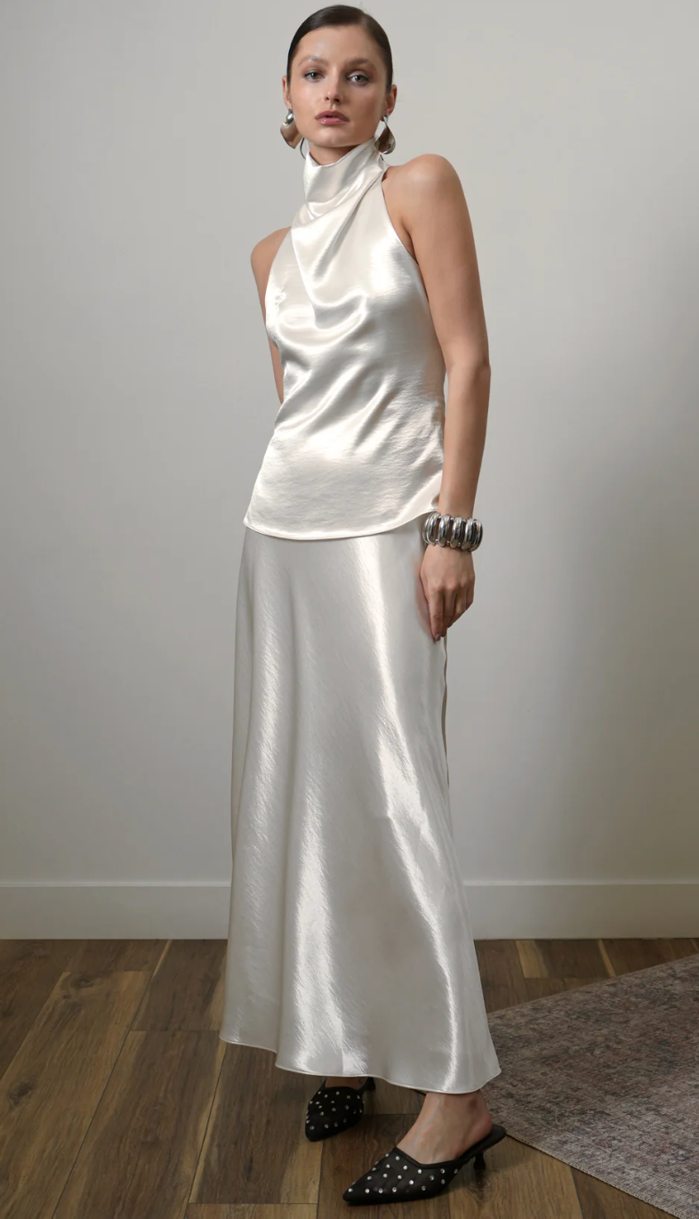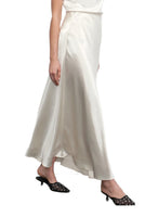 Crafted from a smooth, satiny fabric in a luminous pearl color, the skirt has a classic slip silhouette that elegantly drapes over the body. It features a flattering high-waisted fit and a midi length that falls below the knee. The skirt's design is simple yet chic, with a concealed zipper closure at the back for a seamless finish.Crafted from a smooth, satiny fabric in a luminous pearl color, the skirt has a classic slip silhouette that elegantly drapes over the body. It features a flattering high-waisted fit and a midi length that falls below the knee. The skirt's design is simple yet chic, with a concealed zipper closure at the back for a seamless finish.