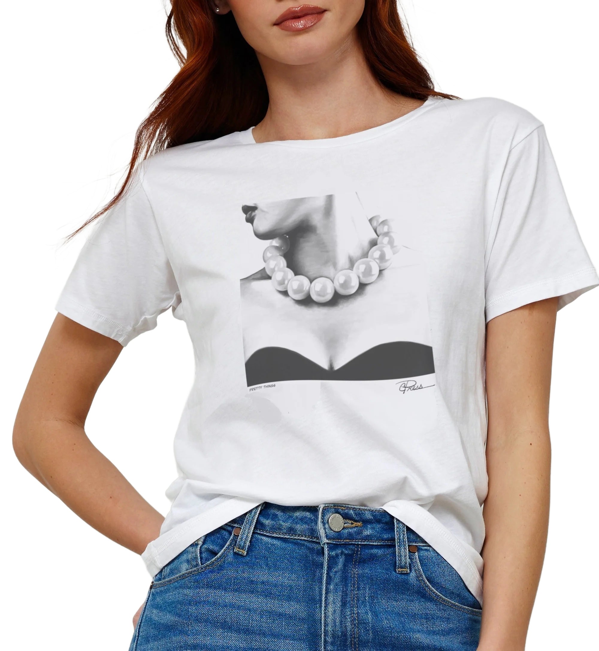 A bit vintage, a bit current, I like pretty things, who doesn't? Pair this tee with trousers and sneakers or your favorite sweats, sophisticated comfort, what could be better?