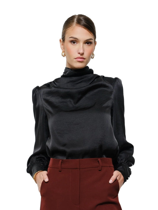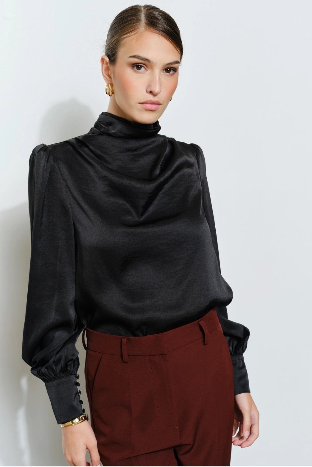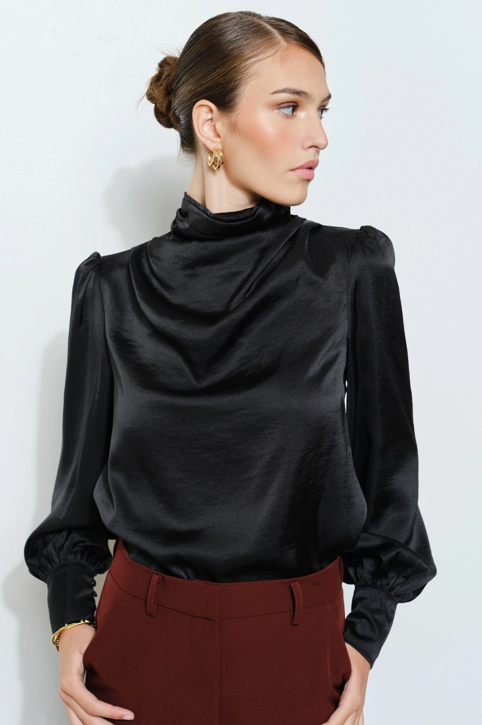 Puff Sleeve Draped Satin High-Neck Blouse-Black