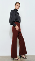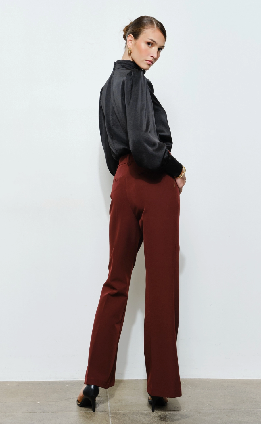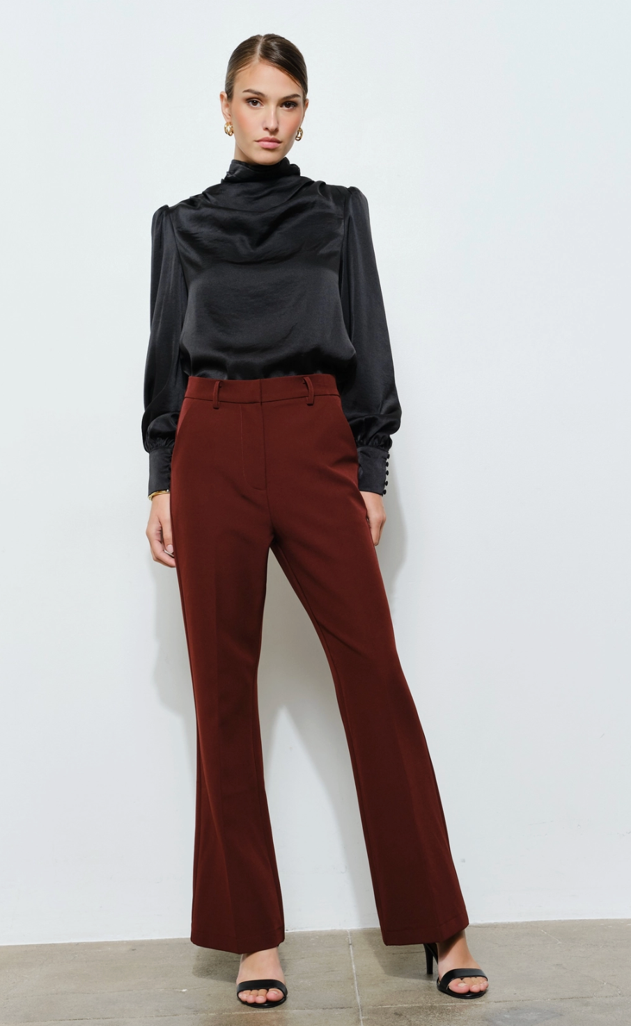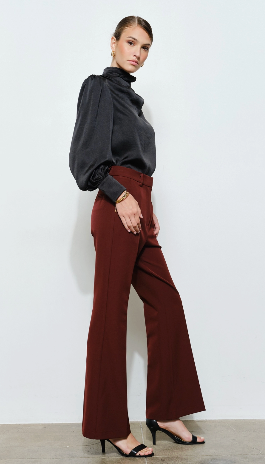 Long Puff Sleeve Draped Satin High-Neck Blouse