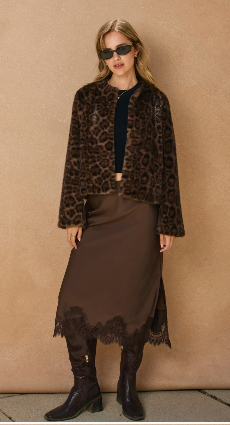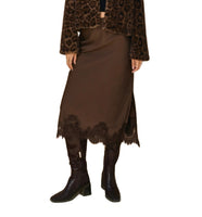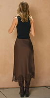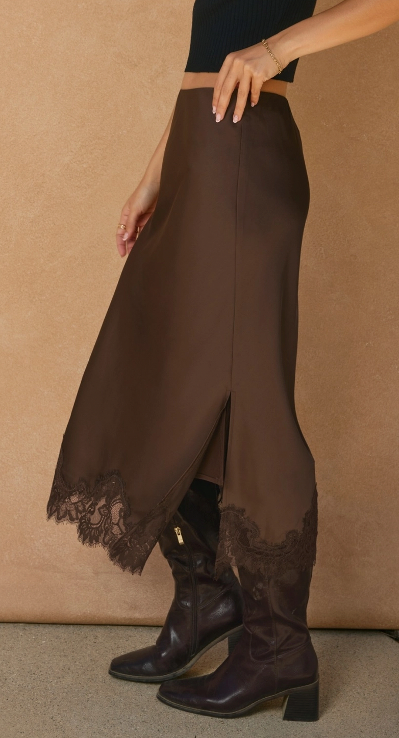 - Pull on - A-Line silhouette - Lace hem - Elastic waistband - Side slit - Lined Shell: 100% Polyester Lining: 95% Polyseter, 5% Spandex
