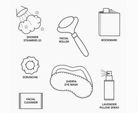 A super cute multi-colored sherpa pouch and sleep mask are accompanied by a full suite of soothing, me-time essentials: stone facial roller, silky scrunchie, lavender mist, refreshing towelette, bookmark, and 2 lavender shower steamers.