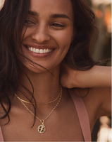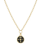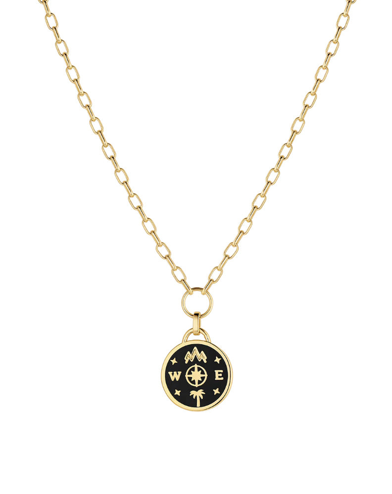 This black enamel and gold plated necklace symbolizes strength, discovery and travel, and features a meaningful compass, palm tree and mountain range. Layer your coin necklace or wear one solo. It's lightweight, eye-catching, and made for every outfit you own.