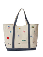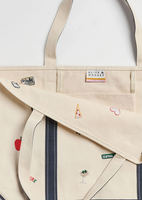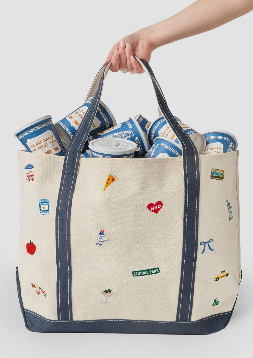 The perfect carryall for Central park days, farmer's market strolls and running all the errands. No matter where you go, it feels like home. Natural embroidered New York City icons tote. Navy shoulder straps reinforced and double stitched. Interior pocket. Heavyweight cotton canvas. Spot clean.
