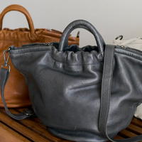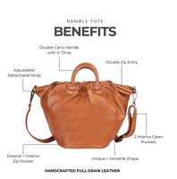 Cross body or satchel?  Our super soft Ramble tote features double zip entry with gentle top rusching detail, unique rounded base.  Can be worn interchangeably as a hand-held satchel or as a cross body.