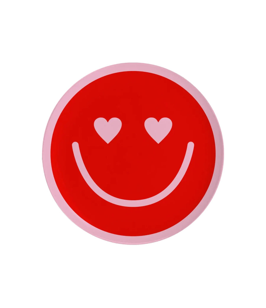 Red Smiley Face Trinket Dish This round trinket dish is the perfect gift. The red smiley face design with hears for eyes has a vintage feel and is sure to delight and brighten up your dresser, vanity, or nightstand. Keep all your treasured rings and small jewelry items safe in this adorable little dish!