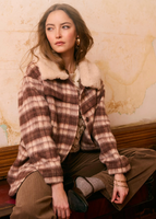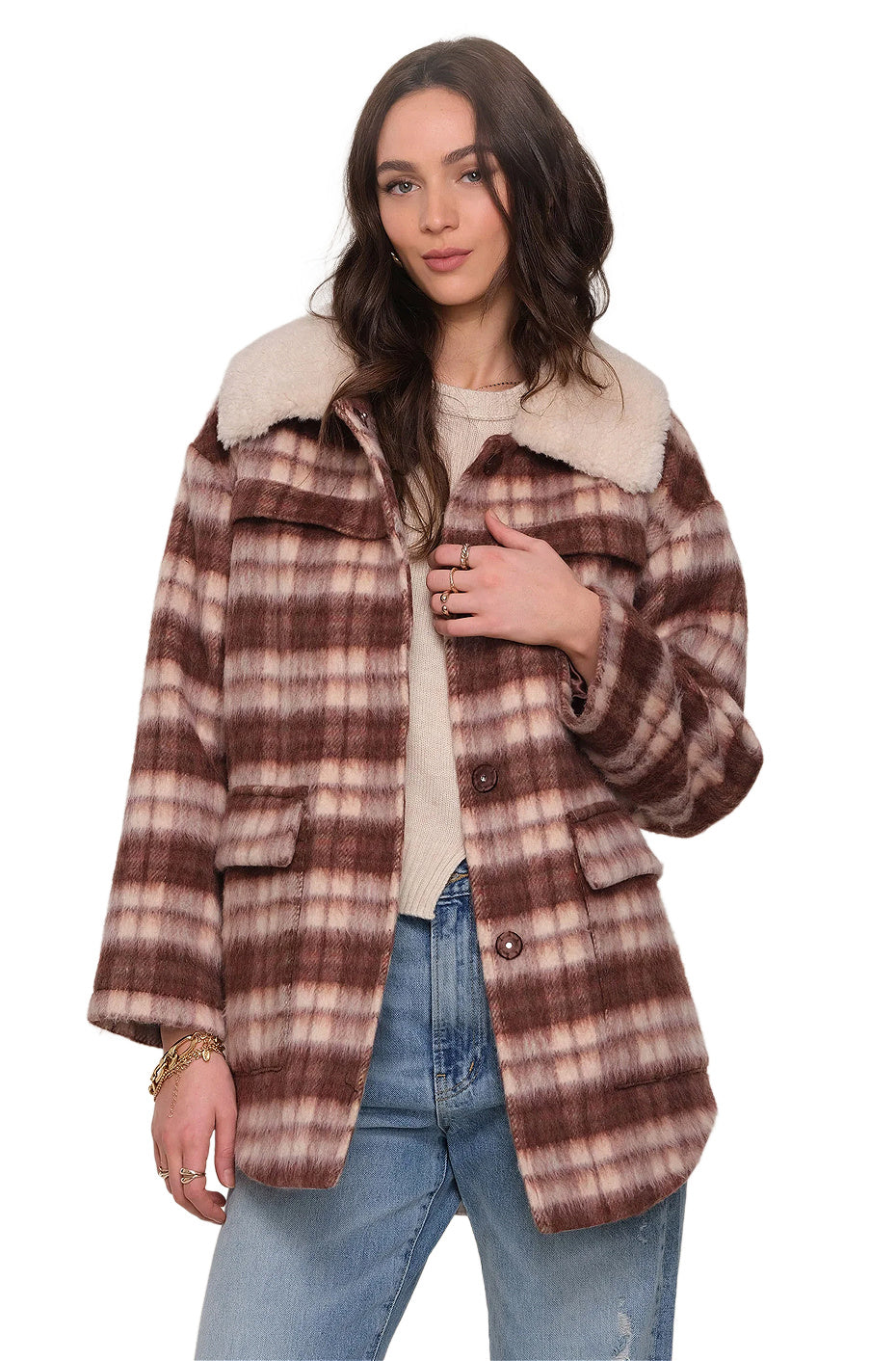 The Ithaca Coat is made from a textured, plaid tailoring. It features a relaxed fit, shirt tail hem and oversized patch pockets. It has a faux shearling collar for ultimate coziness.
