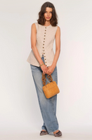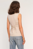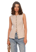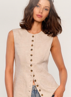 The Josette Vest is a flattering, long-line vest that's cinched in the waist. It has a crew neck and faux horn buttons down the front. We love to pair it with straight leg jeans for a relaxed, casual look.
