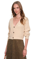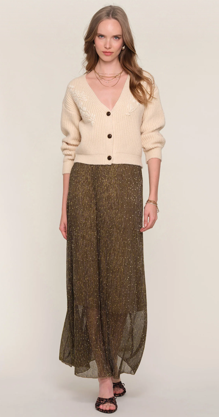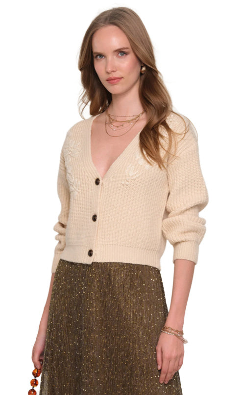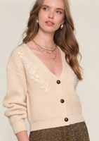 The Adelias Cardi is a v-neck, ribbed sweater with dropped shoulders and a relaxed fit. It features a pretty, floral embroidery at front body.