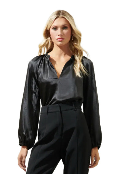 Romance is in the air. Embrace love around you in the Alcazar Blouse. Fashioned from a luxe satin, it shapes a ruffle split neckline framed by long balloon sleeves. It maintains a standard fit and can be styled tucked into high rise trousers and kitten heels.