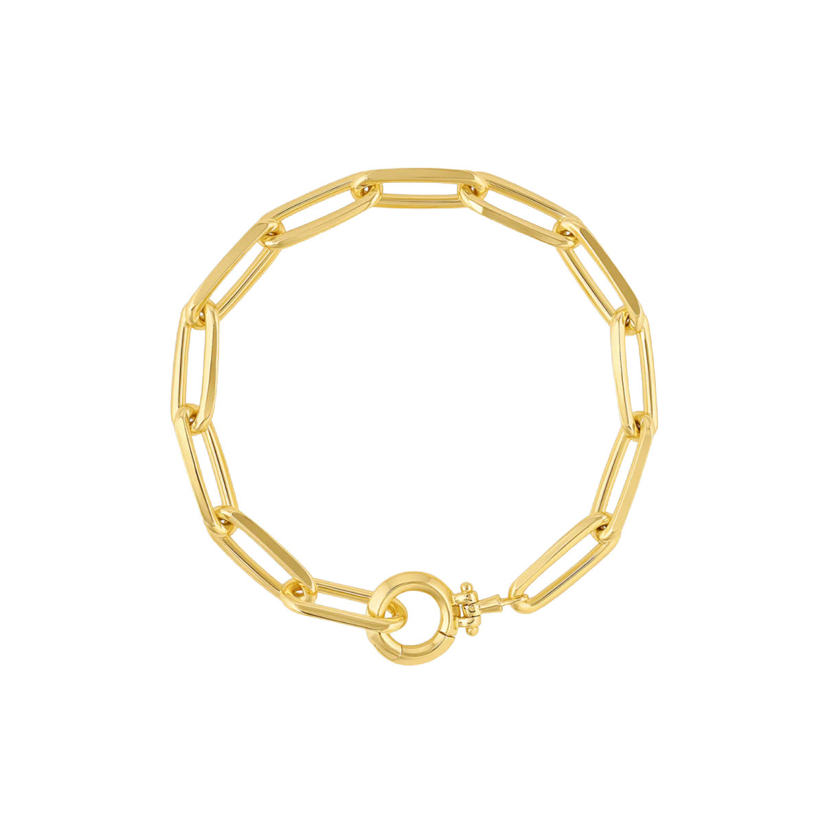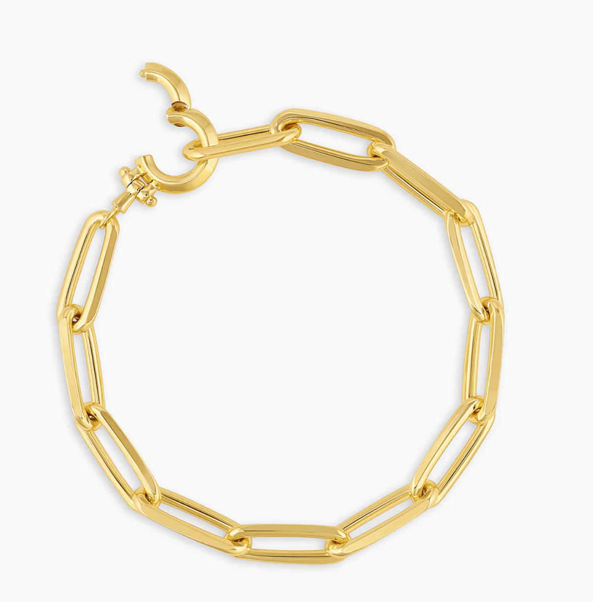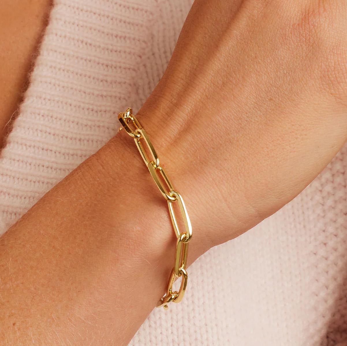 Achieve a cool look with the Parker XL Bracelet. This gorgeous gold plated chain bracelet features an edgy, oversized paperclip chain design that is perfect for any occasion. To wear, stack alongside other gold or diamond bracelets. More is more!