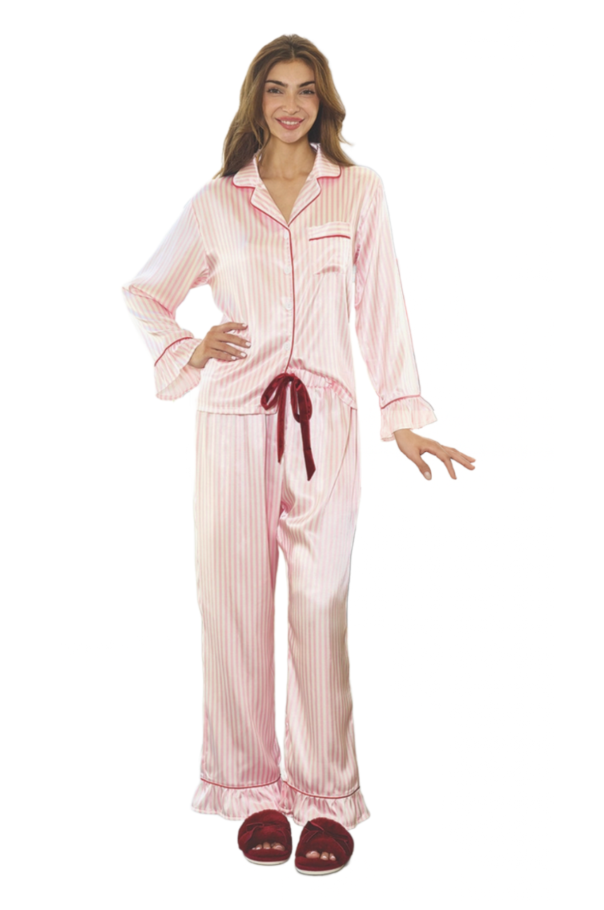 Ruffle Pj Set with Velvet Tie - Pink Stripe