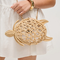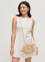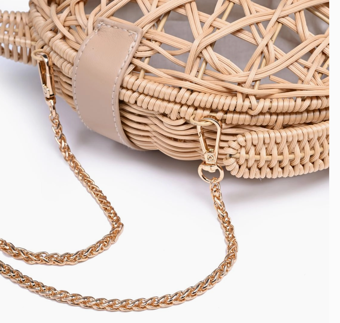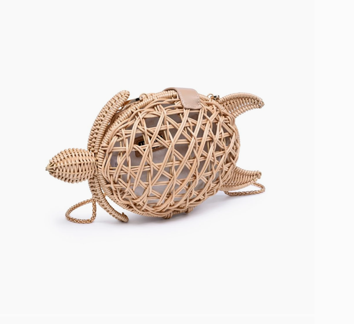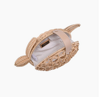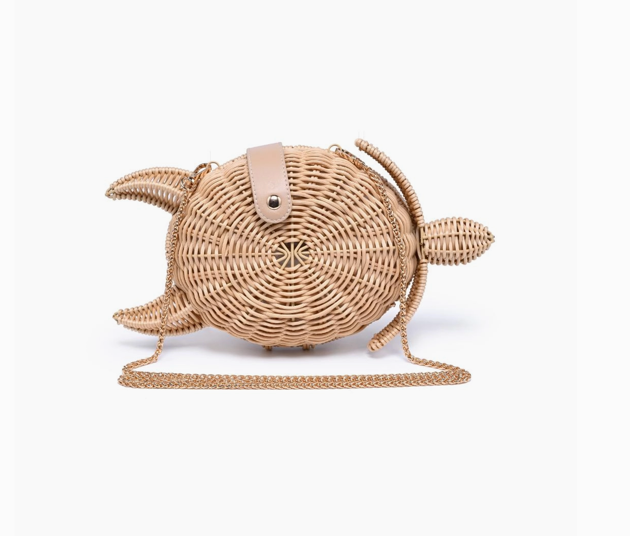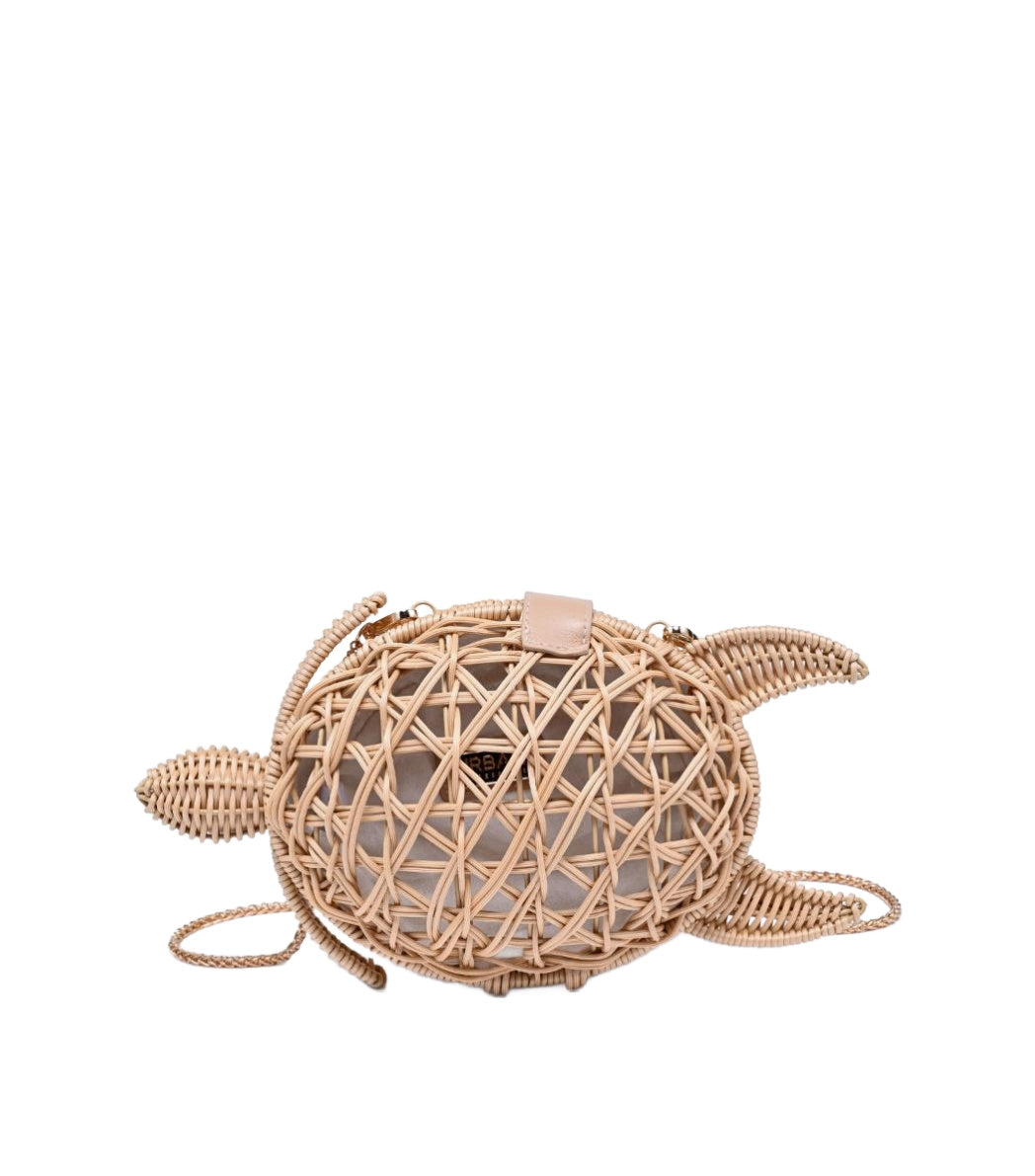 Turtle-shaped woven silhouette, Leilani Crossbody. Playful, refined crossbody bag with a round woven body, inner lined pouch, snap closure and chain strap. Lightweight, hands-free wear for weekends, travel, or evenings out. Statement accessory that fits phone, cards and keys, pairs effortlessly with modern, trend-forward wardrobes.