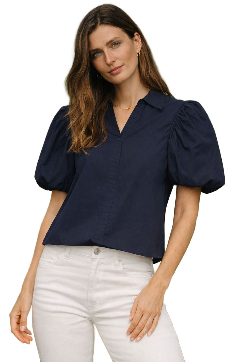 This navy blouse is crafted from crisp 100% cotton, offering an easy, breathable feel with a polished finish. Designed with soft puff sleeves and subtle shoulder gathering, it brings just the right amount of structure and femininity. The relaxed silhouette and flattering neckline make it an effortless everyday piece—perfect worn loose with denim or dressed up with tailored shorts or trousers.
