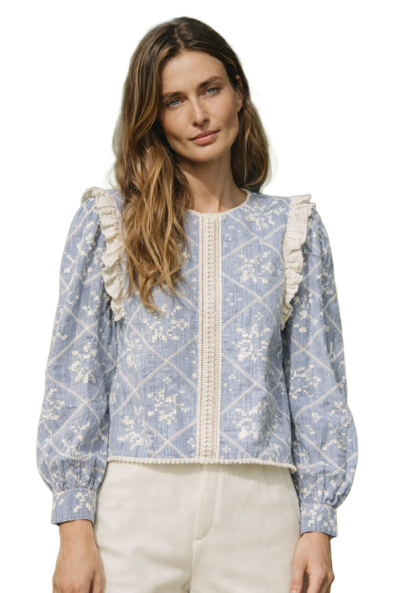 This romantic blue and white blouse features a delicate geometric floral pattern with beautiful lace trim detailing down the front and along the hem. Soft ruffle accents at the shoulders add a feminine touch, while the lightly puffed sleeves and tailored cuffs create an easy, flattering shape. Crafted in a lightweight woven cotton blend, it’s the perfect piece to dress up with tailored shorts or wear casually with denim for an effortlessly chic look.