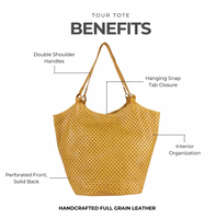 Introducing our perforated, lightweight leather tote that combines sophistication with a relaxed spirit, collapsing gracefully when not in use. Authentic, raw interior + vibrant color options.