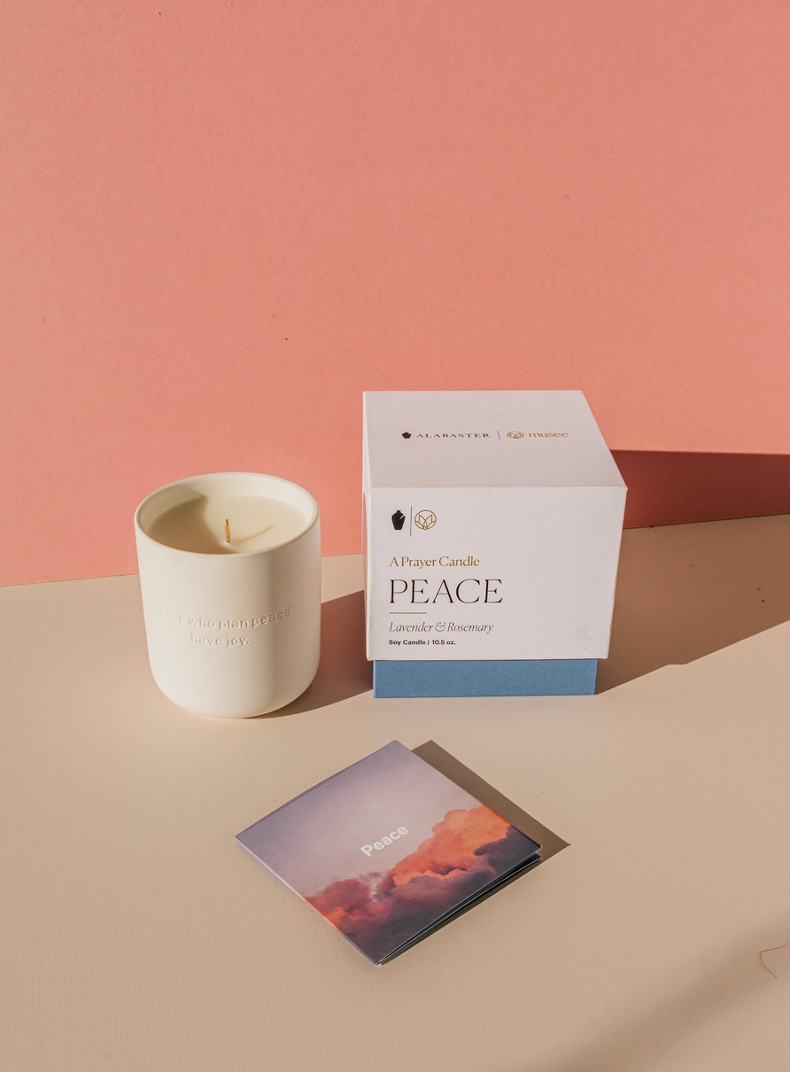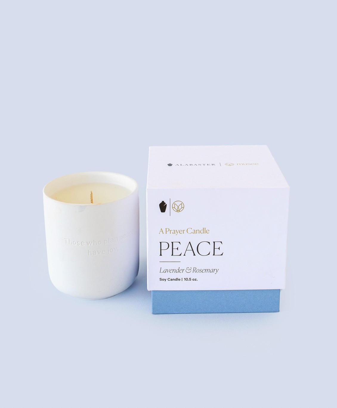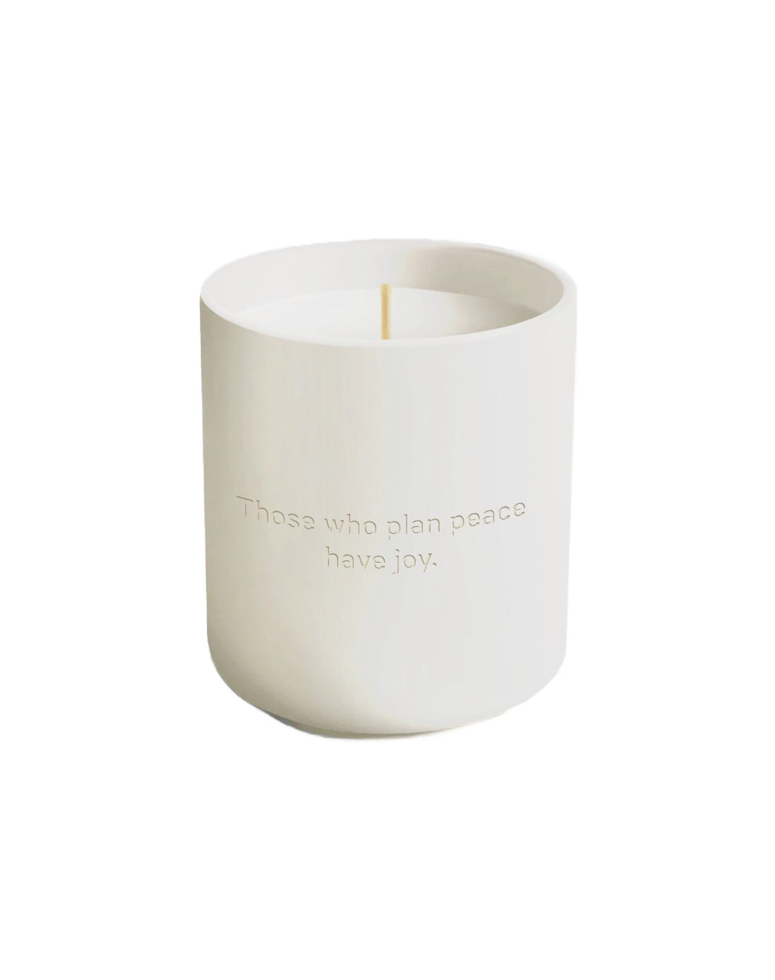 Scents of crisp freshness and green earth, opposites combined, to evoke the bringing together of all things - unity, rest, and ultimately God's peace. Inscribed on the ceramic vessel is "Those who plan peace have joy."