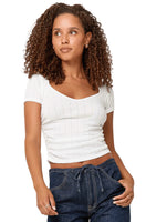 The Dylana Pointelle Sweetheart Neck Tee offers timeless style with a modern edge. Featuring a sweetheart neckline and ruched sides, this form-fitting tee hugs your shape in all the right ways. The subtle vertical pointelle detailing gives the fabric texture and interest, while the soft pointelle fabric adds a delicate touch. Perfect for layering or wearing solo, this tee brings a little something extra to your everyday wardrobe.