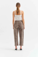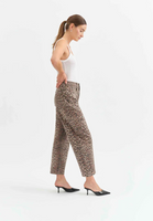 Make a statement in the print of the season. The Westward in Cool Cat is a high rise jean with a trending barrel leg silhouette and a tan and black cheetah inspired print. Featuring a cinched waist, bowed leg, and slightly tapered ankle.